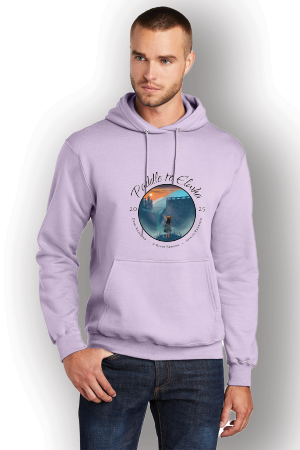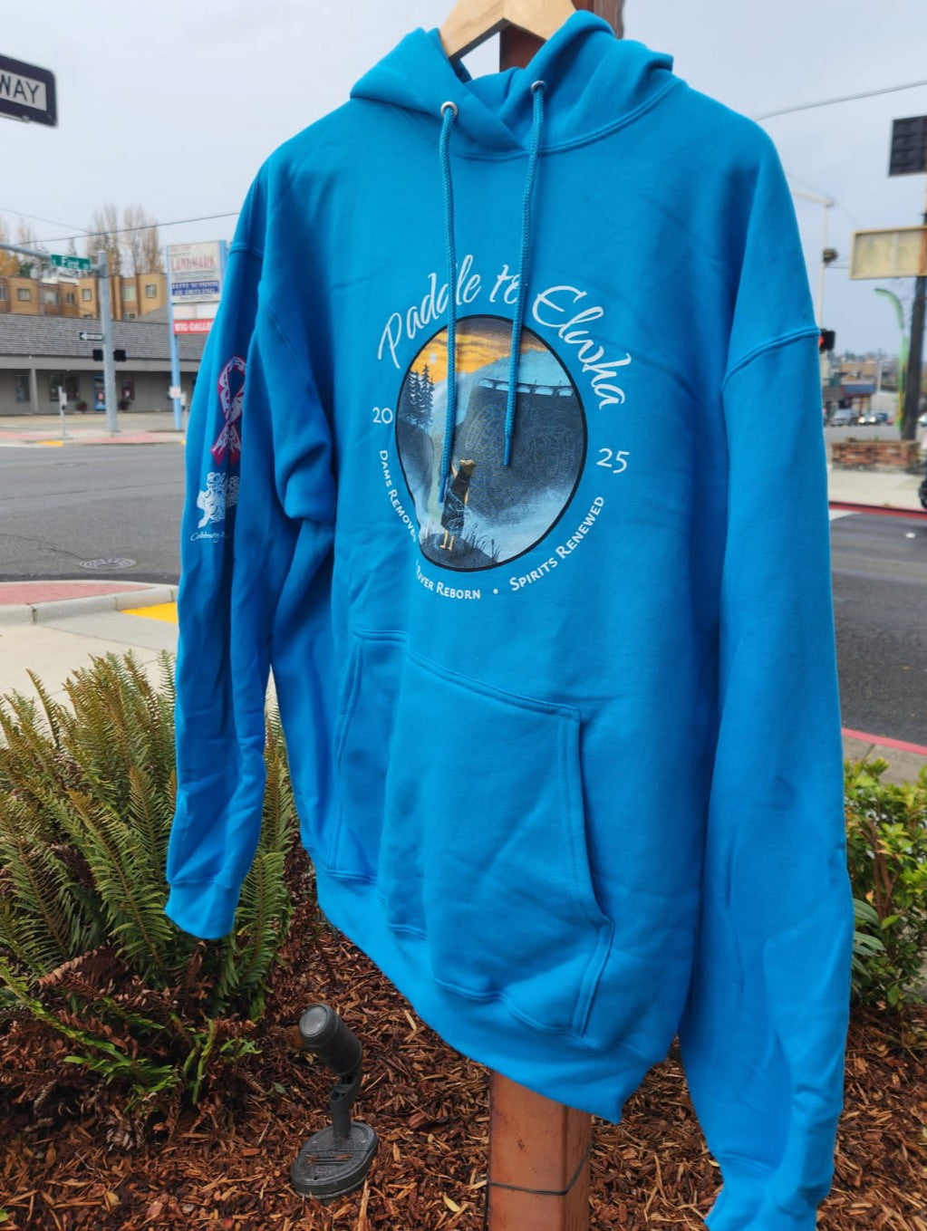 Adult-size hooded sweatshirt featuring the official logo for Paddle to Elwha 2025.